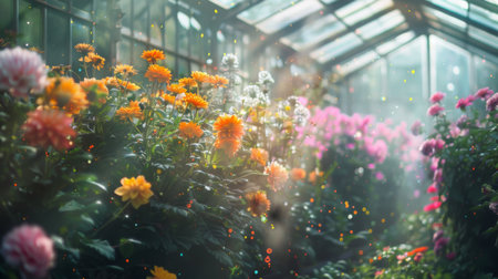 This serene greenhouse scene showcases a variety of colorful flowers and lush greenery, illuminated by sunlit rays, creating a tranquil indoor garden atmosphere.