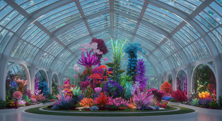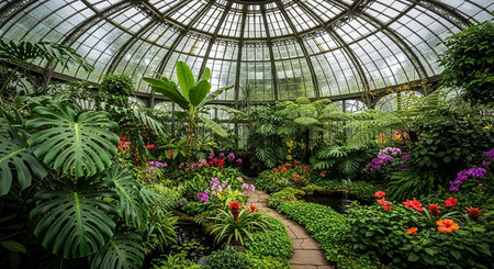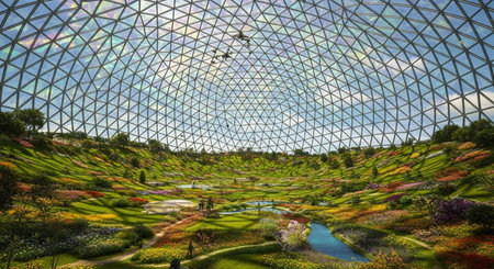 a stunning indoor garden under a geodesic dome, featuring colorful flowers, streams, and walking paths. This image features a transparent background, making it versatile for various design projects.