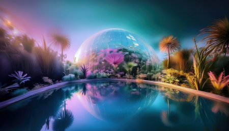 Vibrant reflections ripple across a tranquil pool as exotic plants frame a dome that encapsulates diverse flora and fauna in a serene twilight atmosphere.