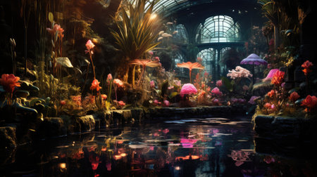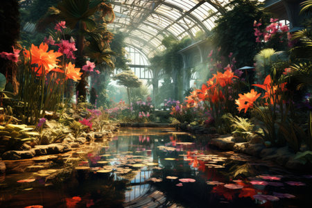 greenhouse filled with colorful blooms and greenery, created with generative ai