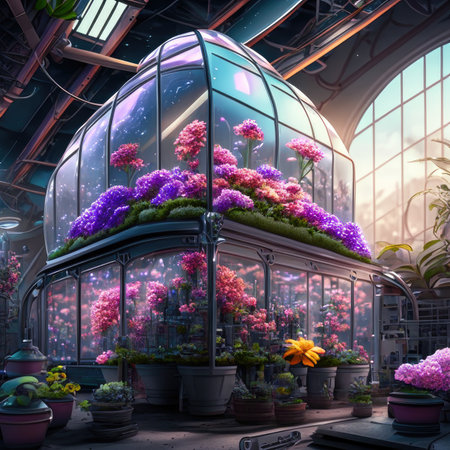 3D render of a greenhouse in the garden at dusk with colorful flowers