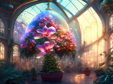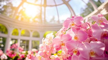 Sunlit greenhouse with vibrant pink flowers and lush foliage at sunrise. That the image is generated using AI.