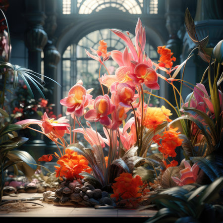Vibrant Flower Display in a Greenhouse Surrounded by Lush Plants on a Sunny Day