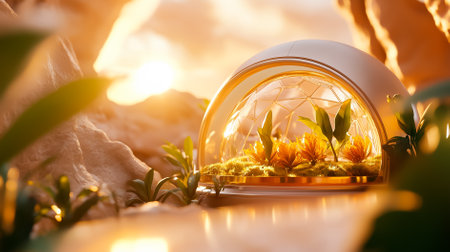 A biodome filled with vibrant plants sits in a Martian landscape, capturing the warmth of a sunset, inviting romance.