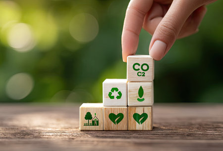 A hand carefully places wooden blocks displaying environmental symbols. The composition features a shallow depth of field, with soft green and brown tones. The lighting is diffused, suggesting an outdoor setting. This image could be used for various projects related to sustainability, conservation, and eco-friendly practices.