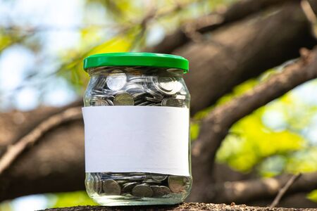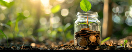 A small tree sprouts from a glass jar filled with coins, suggesting financial growth. The image features a shallow depth of field, highlighting the tree and coins. Warm sunlight bathes the scene, giving it a natural feel. Suitable for illustrating concepts of savings, investment, and financial planning.