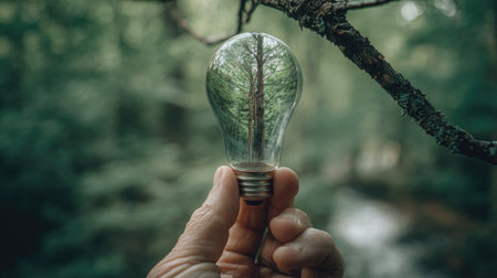 A hand holds a lightbulb containing a tree, set against a soft, blurred forest backdrop. The image displays natural colors and soft focus, suggestive of a daytime environment. The composition hints at themes of sustainability and environmental awareness, suitable for various commercial and editorial applications.