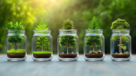 A serene display of miniature trees in transparent glass jars, showcasing growth and the beauty of nature, perfect for eco-focused projects or themes.