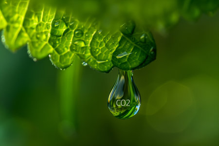 An image presents a globe covered in green vegetation, featuring a prominent CO2 symbol. The composition includes an array of environmental icons surrounding the Earth. The style is digitally rendered, with soft lighting and a focus on natural elements. This scene may be suitable for illustrating environmental concerns or sustainable practices.