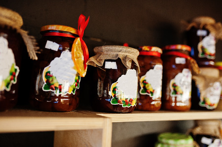 Glass jars with different kinds of jam and berries of a supermarket shelves or grocery store. Homemade canning products. Made with love.
