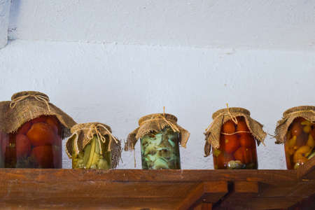 House canned food from vegetables. Stocks of food of residents of the Russian village.