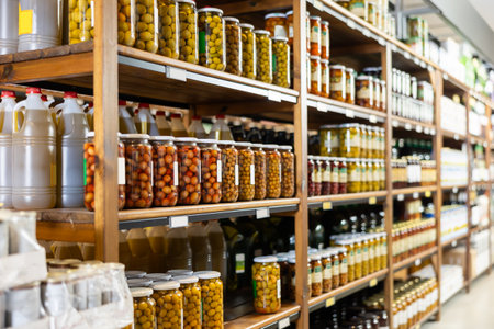Jars with variety of preserved fruits and vegetables on shelf in supermarket
