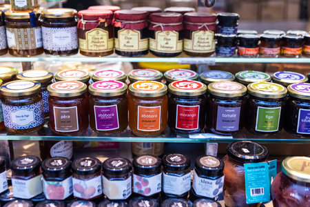 Porto, Portugal - November 23, 2023: Jam, marmalade and compote shop in Bolhao Market, street food market in Porto or Oporto, Portugal
