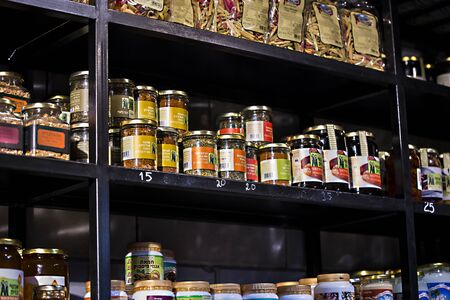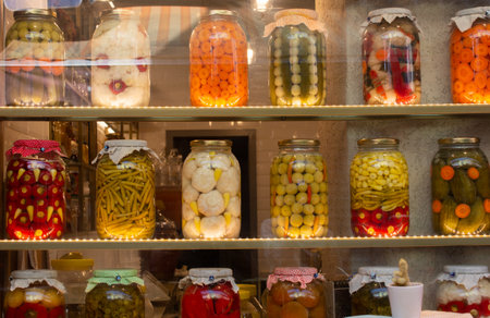 Variety glass jars of homemade pickled or fermented colorful vegetables and jams on the shelves in the food shop. Fermented food concept.