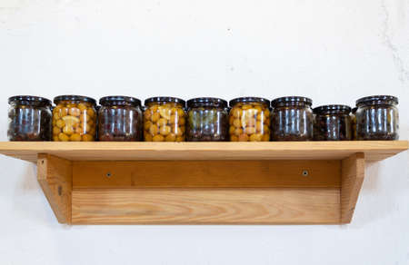 Marinated whole unpitted green olives in jars on shelf rack in store