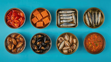 Variety of canned seafood and vegetables, including sardines, mussels, clams, and tomato-based dishes, displayed in open tins on a blue surface.