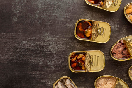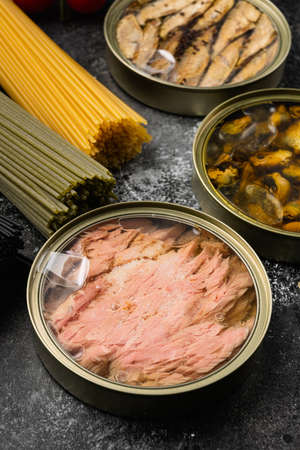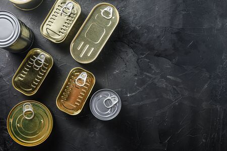 Cans of preserves with tuna, sprat and mussels set, on black dark stone table background