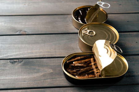 Various types of sealed tin cans and glass jar of canned fish and seafoods on the rustic table, top view