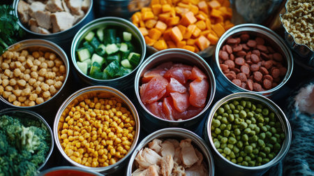 An array of beautifully arranged canned foods showcases an explosion of colors and textures. The selection includes beans, fruits, fish, and vegetables, evoking a sense of abundance.