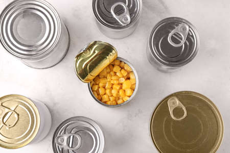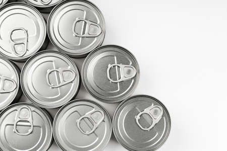 Overhead view various closed tin cans with food preserves. Canned food in different sizes and colors. Stock non-perishable preserved food