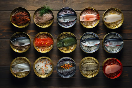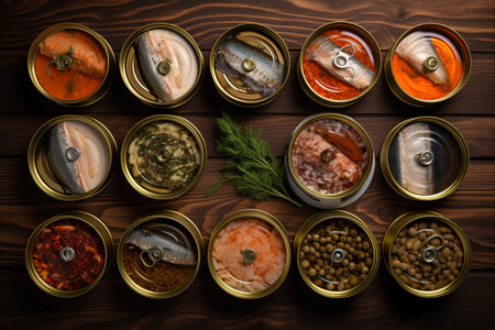 Delicious Seafood Delights: A Scenic Top View of Cans on a Rustic Wooden Background - AR 3:2