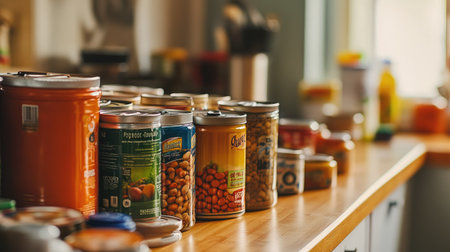 A beautifully organized collection of assorted food cans arranged on a wooden kitchen counter, illuminated by soft natural light, inviting a sense of warmth and home cooking.
