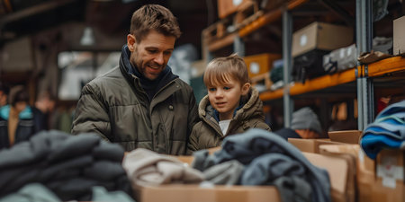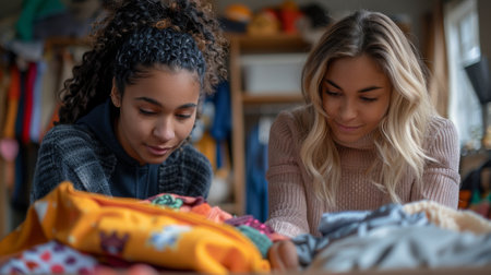 Cozy Family Sorting Clothes for Donation. Concept Family Bonding, Donation Drive, Sorting Clothes, Helping Others, Community Support