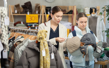 During November sales, young woman choose something autumn clothes, other buyer in background