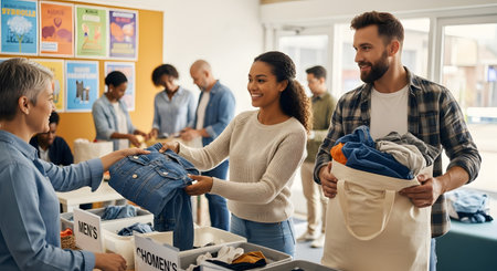 A diverse group of smiling volunteers works together at a community center to sort and pack donated clothing. One woman hands a folded denim jacket to another, while a man holds a filled canvas bag. The scene highlights community service, charity, and the spirit of giving back.