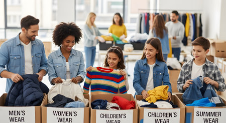 A diverse group of smiling volunteers, including adults and children, sorts donated clothing into cardboard boxes labeled 'Men's Wear,' 'Women's Wear,' and 'Children's Wear.' They are working together in a bright room, organizing items for charity. The image highlights community service, generosity, and teamwork.