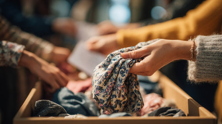 Close-up of a person's hands placing gently used clothing into a donation bin, with a focus on the act of giving, set against a backdrop of a busy city street, promoting urban recycling and charity.