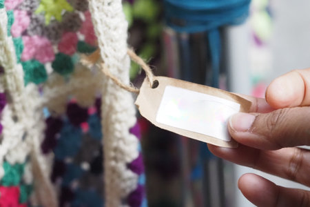 Hand holding a tag on a colorful crochet garment