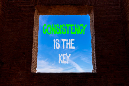Consistency is the key symbol. Concept words Consistency is the key on beautiful window in ancient brick wall. Beautiful blue sky background. Business consistency is the key concept. Copy space.