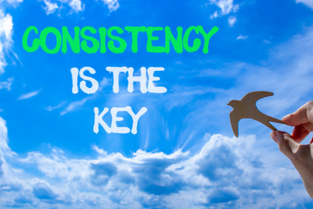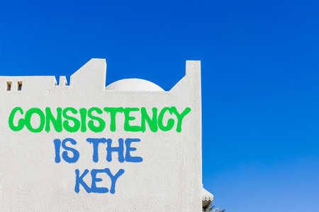 Consistency is the key symbol. Concept words Consistency is the key on beautiful white wall. Beautiful blue sky background. Business consistency is the key concept. Copy space.