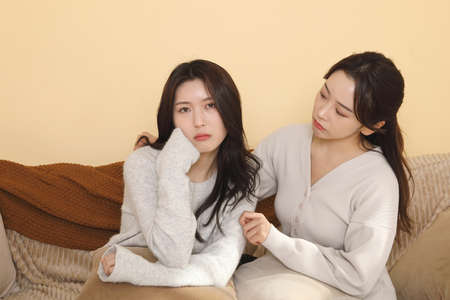 I love you so much. Sad best friends hugging while sitting on the couch. Young women comforting each other while having a depressing conversation