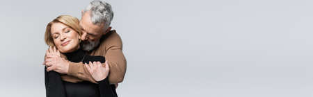 handsome boyfriend hugging girlfriend in sweater with closed eyes