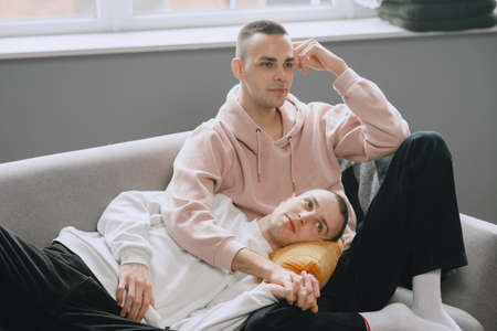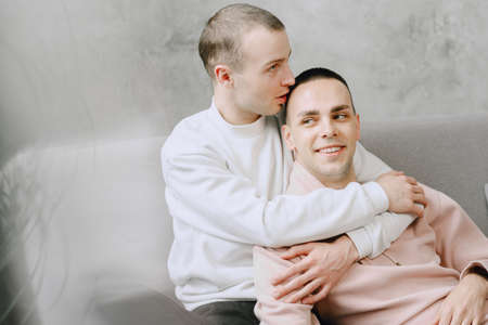 Gay Couple Love Home Concept. gay couple enjoying leisure time in living room