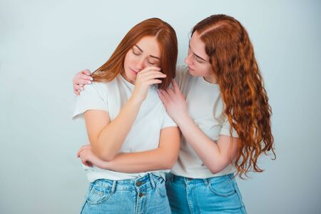 two redheaded young women both standing on isolated white backgroung one consoles her upset crying friend, friendship and support concept
