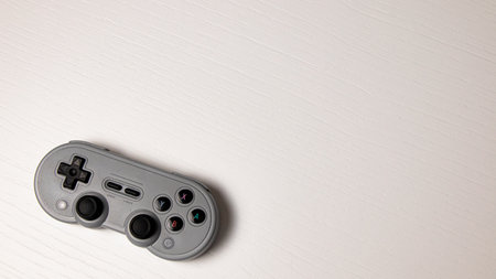 A white gamepad on a white wooden background. Copyspace.