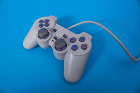 Joystick gaming controller isolated on blue background , Video game console developed Interactive Entertainment