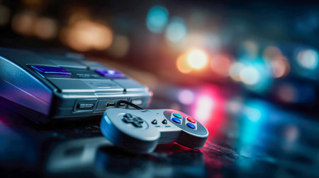 Neon-lit retro game console with a wired controller, glowing with nostalgic gaming atmosphere.
