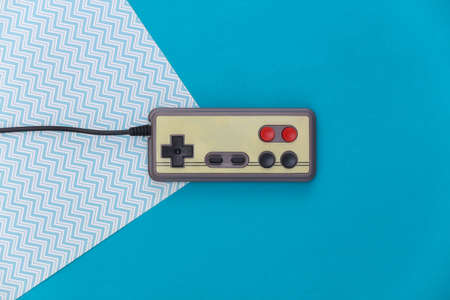 Wired retro gamepad (joystick) on a blue background. retro waves. 80s top view