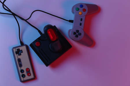 Retro gamepads and joysticks in red blue gradient neon light. Video game, gaming 80s. Flat lay, top view.