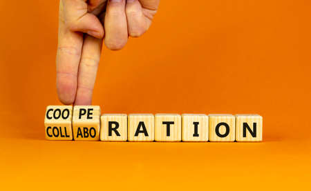 Cooperation or collaboration symbol. Businessman turns cubes, changes words 'collaboration' to 'cooperation'. Beautiful orange background. Business, cooperation or collaboration concept. Copy space.