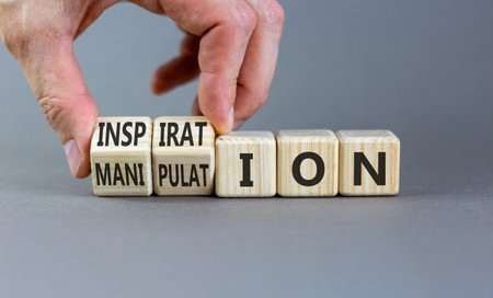 Inspiration or manipulation symbol. Concept words Inspiration and Manipulation on wooden cubes. Beautiful gray background. Psychologist hand. Psychology inspiration manipulation concept. Copy space.