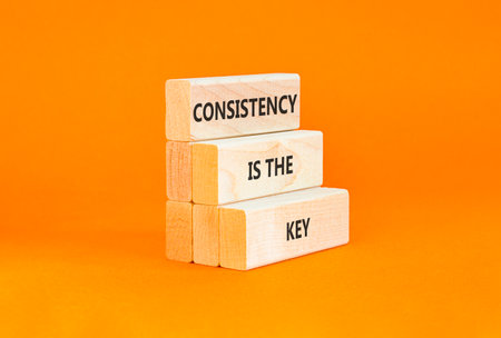 Consistency is the key symbol. Concept words Consistency is the key on beautiful wooden blocks. Beautiful orange background. Business consistency is the key concept. Copy space.