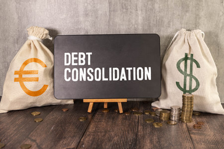 Flat lay of debt consolidation plan in paper on desk with copy space, top view.