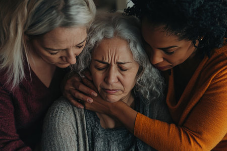 Touching scene featuring two adult women comforting an elderly caucasian woman, moment of empathy and solidarity among different races and ages.