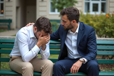 A young man comforts his sad friend who is crying with his head in his hands on a park bench. The scene takes place in an autumn park, depicting support, friendship, empathy, and mental health awareness.
