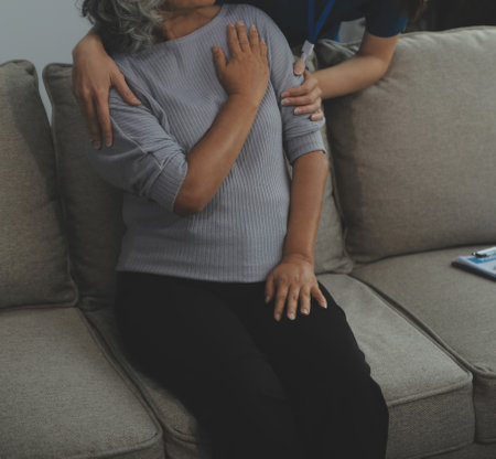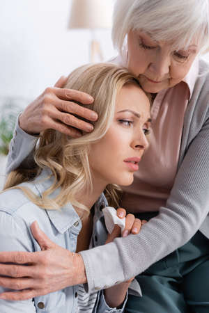 Elderly mother calming and hugging upset daughter at home